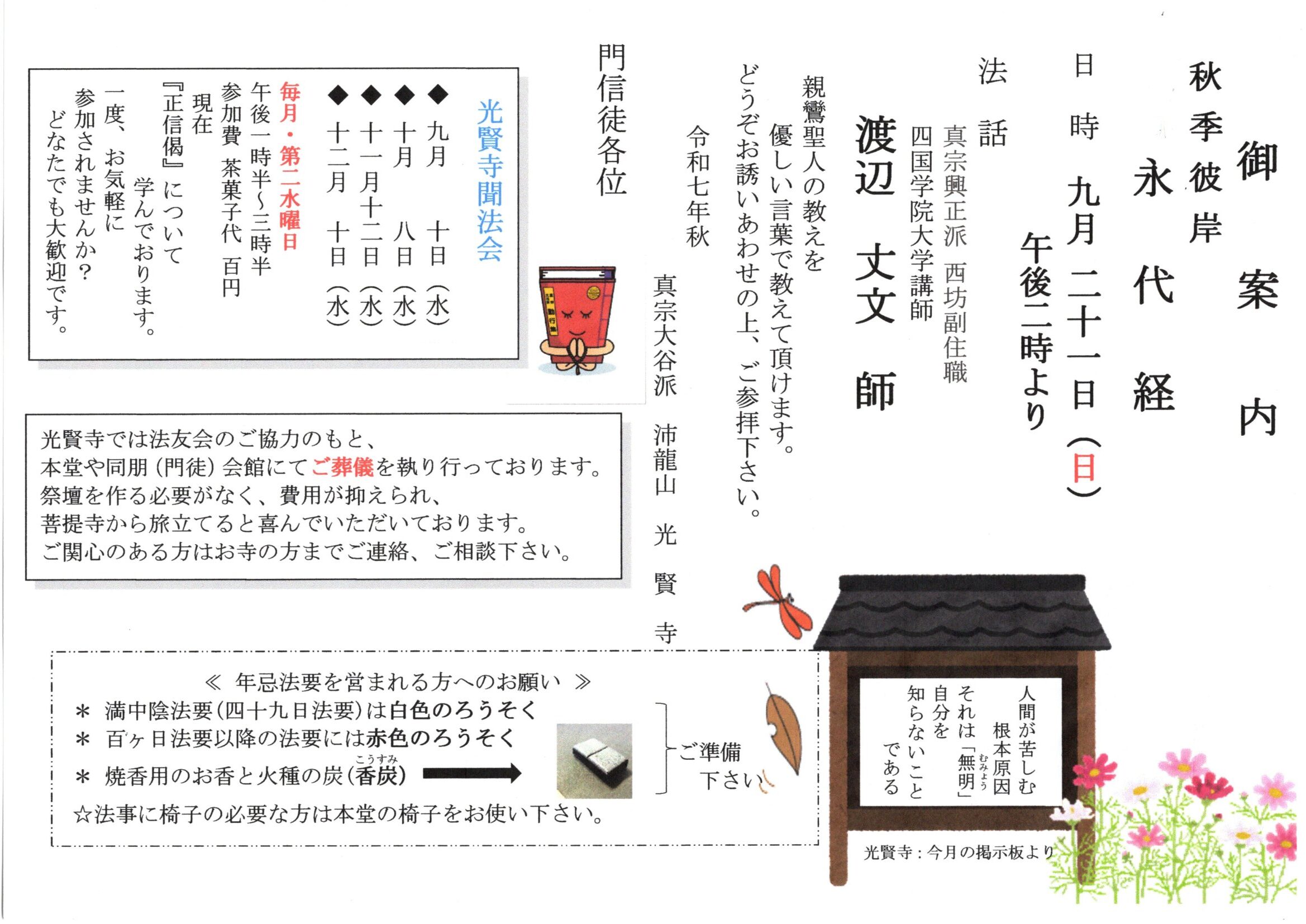 光賢寺の秋の永代経法要が今月21日に営なまれました。前日の雨も上がり良い天気となりご門徒の方々も参拝