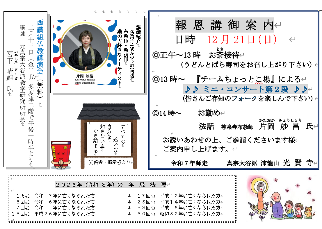 お斎の後、13時より去年に引き続き、まんのうの陽水と呼ばれている男性がギター、女性がキーボードの二人組のグループ「ちょっとこ場」による第2段ミニコンサートだが行われます。お斎を召し上がってからぜひお楽しみください。